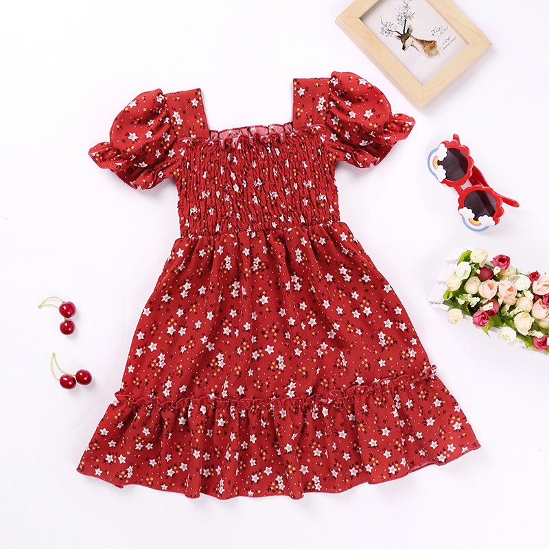 Left Mama Girl Kids Dress Baby Floral Square Collar Short Puff Sleeve Ruffle Red Princess Dress For Girls 2 6 Years Shopee Malaysia